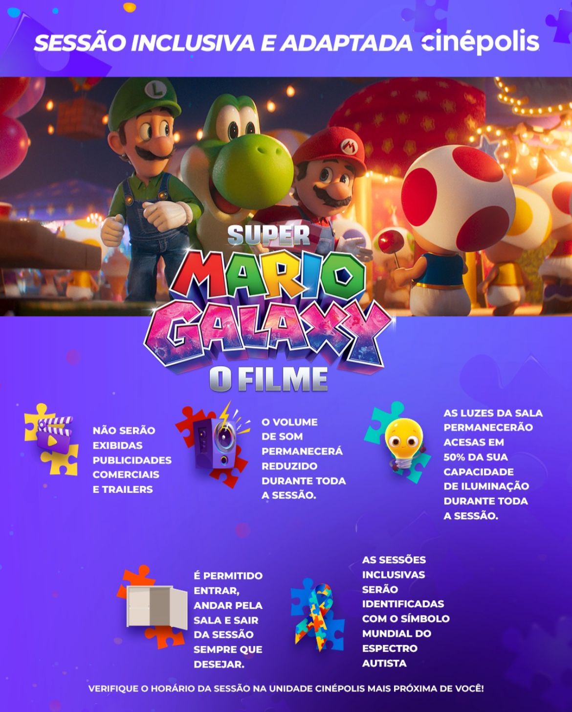 As sessões inclusivas de Super Mario Galaxy acontecem nas seguintes unidades: